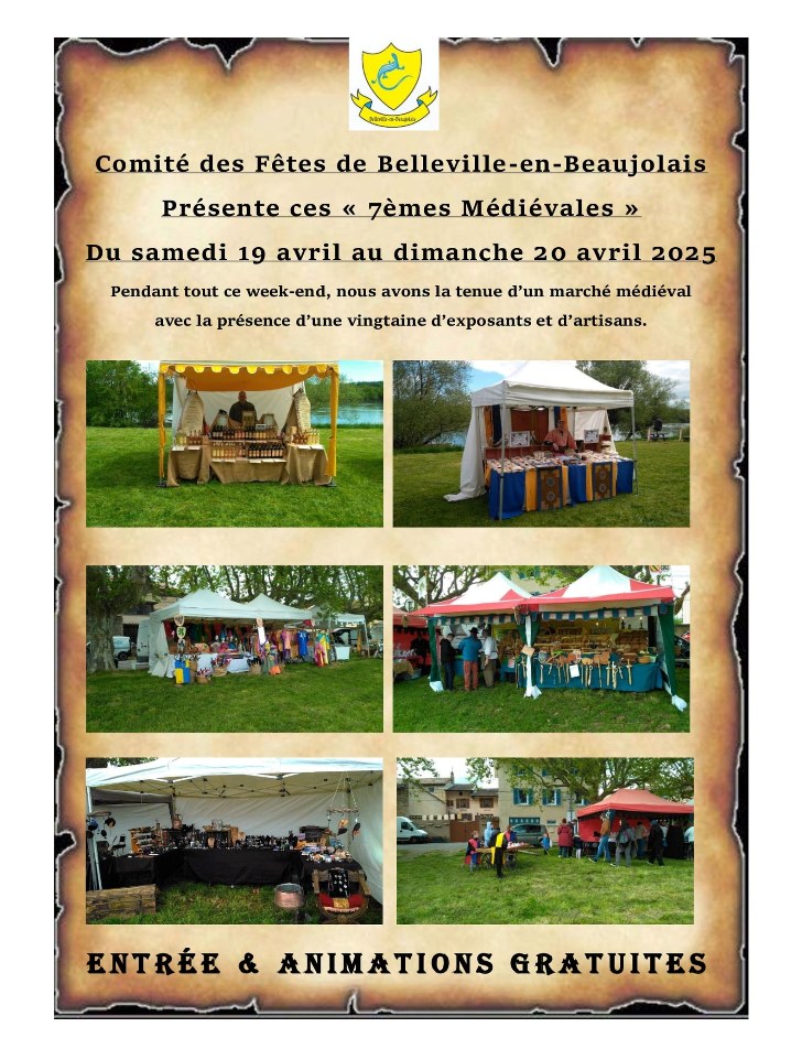Le comité des fêtes de Belleville et Les Mercenaires du Désert Des Larmes organisent le samedi 19 avril 2025 de 13h à 21h et le dimanche 20 avril 2025 de 10h à 19h les médiévales de Belleville en Beaujolais avec différents artisans, campement, démonstration de combat à l’épée, jeux d’antan, et bien d’autres activités. La fête médiévale se tient sur le port de Belleville. Entrée gratuite (sauf pour la chasse aux oeufs 1€). Chien interdits.