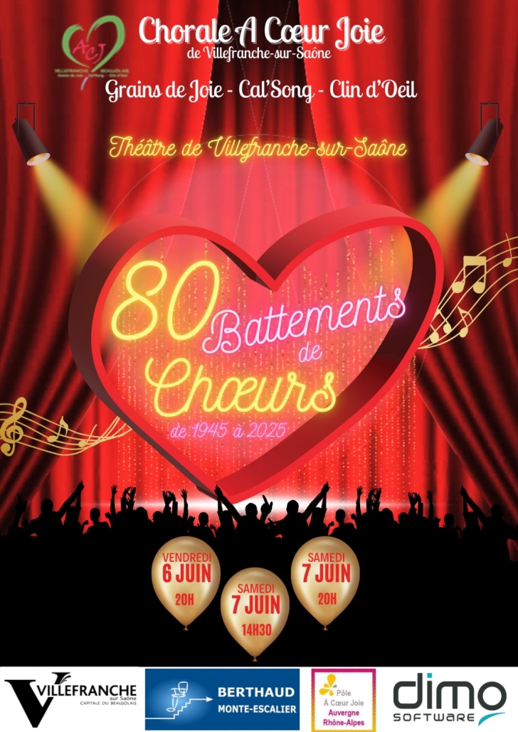 La Chorale A Cœur Joie de Villefranche a le plaisir de vous annoncer son nouveau spectacle « 80 battements de chœurs » qui se tiendra au théâtre de Villefranche le vendredi 6 juin 2025 à 20h et le samedi 7 juin 2025 à 14h30 et 20h
