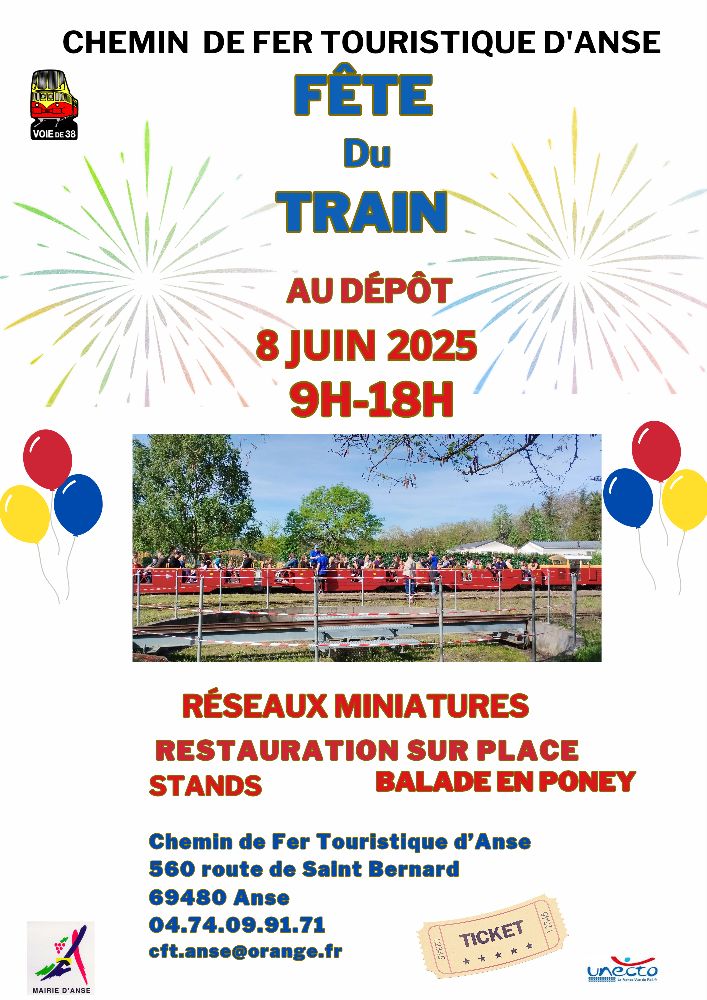 Le chemin de fer touristique d’Anse organise la Fête du train d’Anse le 8 juin 2025 de 9h à 18h à l’Atelier. Visite du dépôt, promenade en train, animations et attractions. Buffet, buvette. Traif unique 5€. Un beau moment en famille. Vos enfants adoreront.
