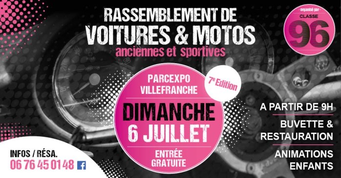 Le dimanche 6 juillet 2025 a lieu la 7ème édition du rassemblement de voitures et motos anciennes et sportives à ParcExpo de Villefranche sur Saône à partir de 9h. Cette manifestation est oragnisé par la Classe 96 des Conscrits du rassemblement de voitures et motos ! *ENTRÉE GRATUITE*. Profitez de la buvette et de la restauration sur place pour recharger les batteries ! Ambiance musicale et jeux pour enfants seront également au programme. Que vous soyez passionné(e) de voitures et motos anciennes, sportives ou custom, venez partager cette journée avec nous.