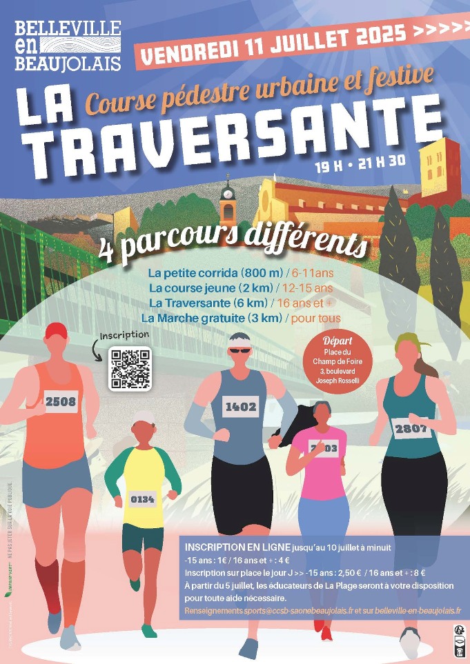 Venez nombreux le vendredi 11 juillet 2025 pour participer à la corrida pédestre "La Traversante" de Belleville en Beaujolais. Une corrida pédestre est une course de fond qui se déroule dans les rues d’une ville. Imaginez vous courir à travers des bâtiments de Belleville-en-Beaujolais, comme le Centre Culturel Le SingulierS, la mairie ou encore la cour de l’Hôtel-Dieu. Ambiance festive et décontractée. Les participants sont invités à venir déguisés s’ils le souhaitent !