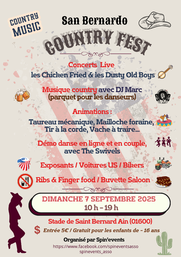 L’association Spin’events organise son premier festival Country le Dimanche 7 septembre 2025 à SAINT BERNARD (01600). Le festival aura lieu au stade de SAINT BERNARD de 10h à 19H.