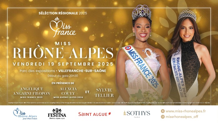 L’élection Miss Rhône-Alpes 2025 a lieu cette année au ParExpo de Villefranche sur Saône le vendredi 19 septembre 2025 en présence de : Angélique Angarni-Filopon, Miss France 2025 et Sylvie Tellier. Qui succédera à Alexcia Couly ?