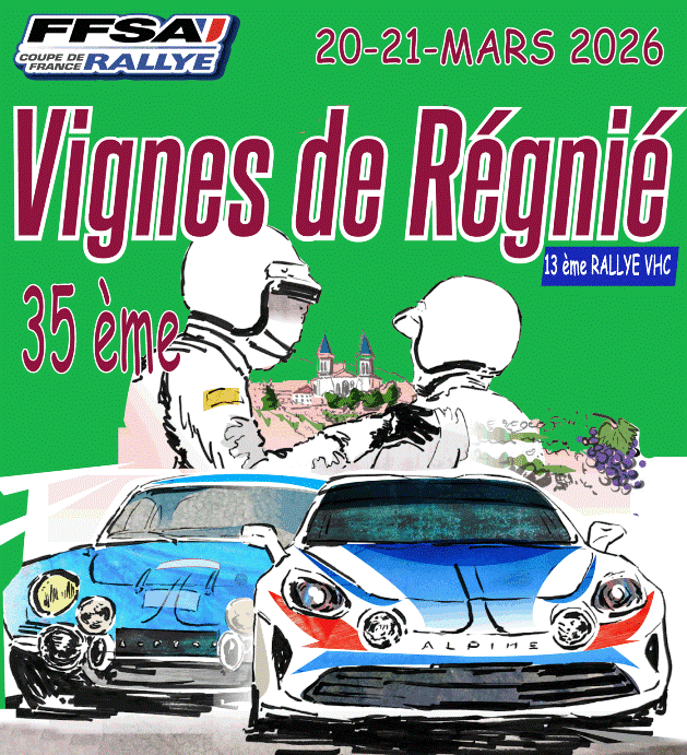 L’Association Sportive Automobile du Beaujolais avec le concours (ASAB) , Du CRU REGNIE et du COMITE DES FETES DE REGNIE-DURETTE, Organise le 35 eme RALLYE RÉGIONAL des VIGNES de REGNIE et le 13ème RALLYE VHC le 20 et 21 mars 2026. Le Rallye compte pour la coupe de France des rallyes 2026 coefficient 2 et la challenge Rhône-Alpes 2026.