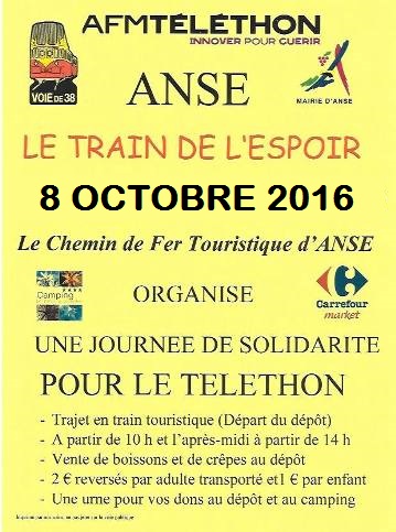 Samedi 8 octobre 2016 à Anse, le Chemin de fer touristique d’Anse organise une journée solidaire pour le Téléthon 2016 intitulée : "Le Train de l’Espoir"