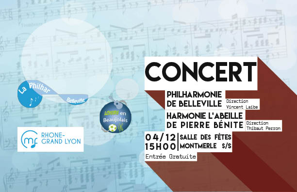 Comment ne pas vous faire part du concert de la Philharmonie de Belleville qui invite l’Harmonie l’Abeille de Pierre Bénite pour un concert inédit le 4 décembre 2016 à 15h à la salle des fêtes de Montmerle sur Saône.