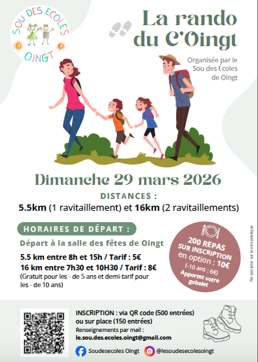 Le Sou des écoles dOingt organise la Randonnée du C’Oingt le 29 mars 2026 de 7h30 à 15h00. Dépat à la Salle des fêtes. Réservation jusqu’au 26 mars 2026 (inclus).