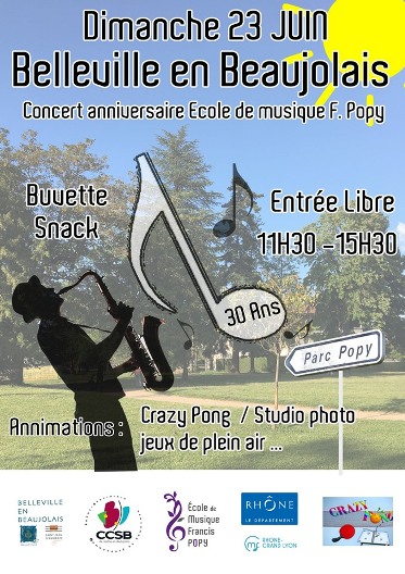 A l’occasion de ses 30 ans, l’école de musique F. POPY de Belleville en Beaujolais vous invite à son concert champêtre le dimanche 23 juin 2019 en plein air au parc Popy.