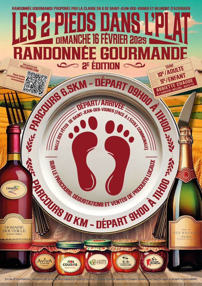 Les classes en 2 organisent le dimanche 16 février 2025 une randonnée gourmande avec 2 circuits. Départs de la salle des fêtes de Saint-Jean des Vignes de 9h à 11h. AU programme, circuit de 6,5 km et de 10km. Sur le trajet, nos partenaires vous proposeront de goûter leurs produits locaux et gourmands. A votre arrivée, nous vous servirons un bon plat chaud (réservé aux randonneurs en prévente). Une buvette vous proposera crêpes et boissons. Vous pourrez également vous procurer des produits dégustés lors de la rando.