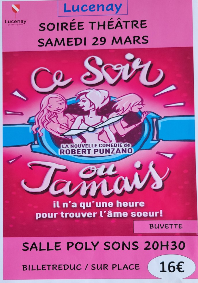 La commune de Lucenay est heureuse de vous proposer une soirée théâtre le samedi 29 mars 2025 à 20H30 à la salle Polysons : "CE SOIR OU JAMAIS" par le « COEUR DE SCENE PRODUCTION ». Ce spectacle est actuellement en tournée nationale et fera une escale le 29 mars sur Lucenay. TARIF 16€ – BUVETTE.