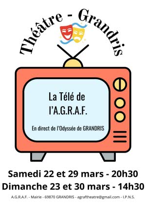 L’Agraf, l’Association de théâtre de Grandris vous propose "La Télé de l’Agraf". Une interprétation de quatre courtes pièces humoristiques sur le thème "Et si le théâtre s’invitait à la télévision ?" (billets en vente à la buvette du marché le jeudi matin). Vous allez passer un bon moment convivial. N’oubliez pas vos mouchoirs !!!