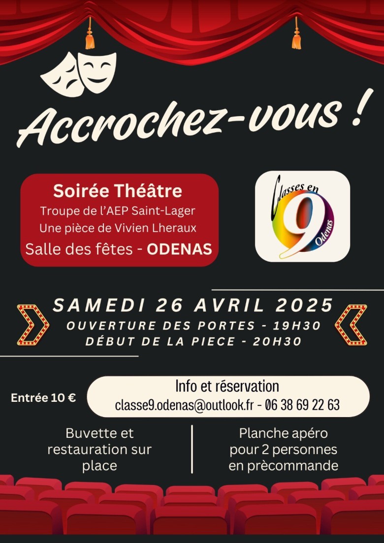 L’ AEP de Saint-Lager propose une pièce de théâtre enfants et adultes à Odenas le 26 avril 2025 à 20h30 à la salle des fêtes d’Odenas. "Accrochez-vous". Une comédie de Vivien Lheraux.