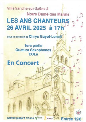 - 26/04/2025 : Les ANS CHANTEURS sont en concert à l’église Notre Dame des Mariais de Villefranche sous la direction de Chrys Guyot-Lonait à 17h avec en première partie le Quatuor de Saxophones EOLe Entrée : 12€, Gratuit pour les moins de 13 ans.