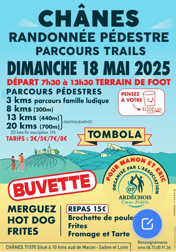 Dimanche 18 mai 2025, venez marcher à Chânes (71570) pour soutenir l’association "Ardéchois Coeur Fidéle". Au programme 3 circuits de randonnée (3km/8km/13km/20km) avec de beaux paysages entre vignes et roches.