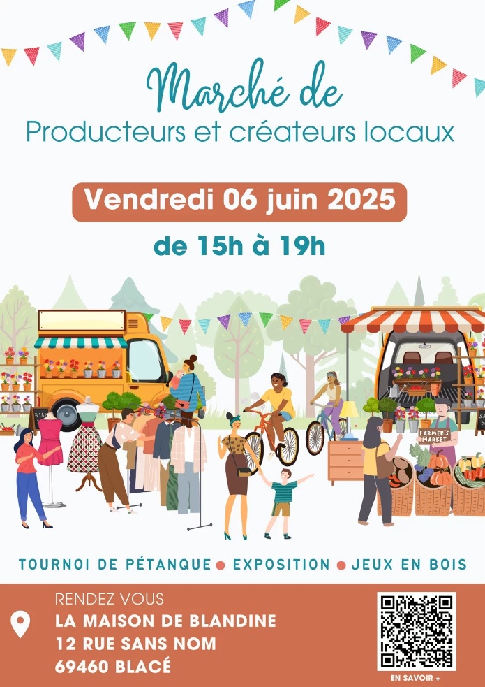 Le vendredi 6 juin 2025 a lieu le marché de Producteurs et Créateurs à la Maison de Blandine de Blacé dans le Beaujolais de 15h à 19h. Plus de 15 exposants
