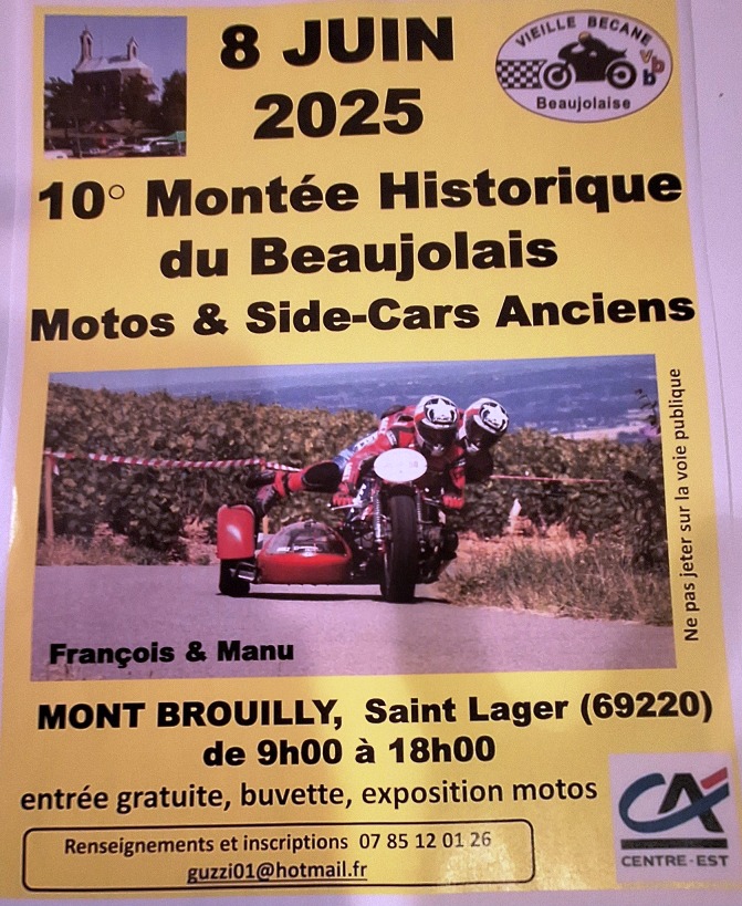 L’association "VIEILLE BECANE BEAUJOLAISE" organise la 10ème Montée Historique du Beaujolais au Mont Brouilly le dimanche 8 juin 2025. Un grand rendez-vous de passionnés de motos anciennes. Les montées se dérouleront de 9h00 à 12h00 et de 13h30 à 18h00. Attention : inscription obligatoire.