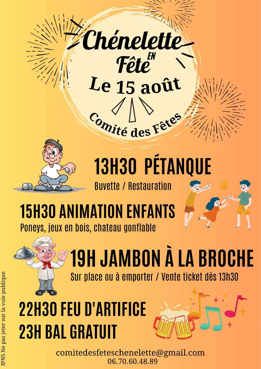 - Chénelette en fête avec feu d’artifice à 22h30.