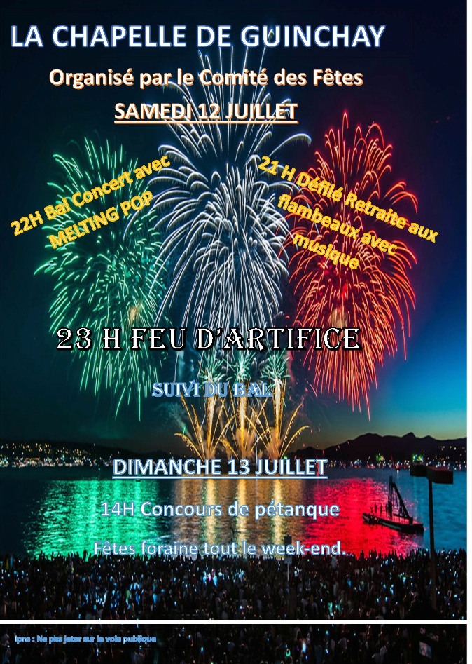 - 22h30, assistez au feu d’artifice organisé par la mairie sur le parvis de la salle des fêtes.