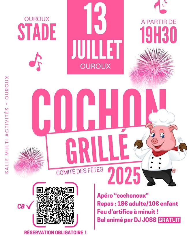 Fête du Cochon grillé d’Ouroux. Rdv à partir de 19h30, Bal géant gratuit et feu d’artifice à minuit. Réservation sur HelloAsso