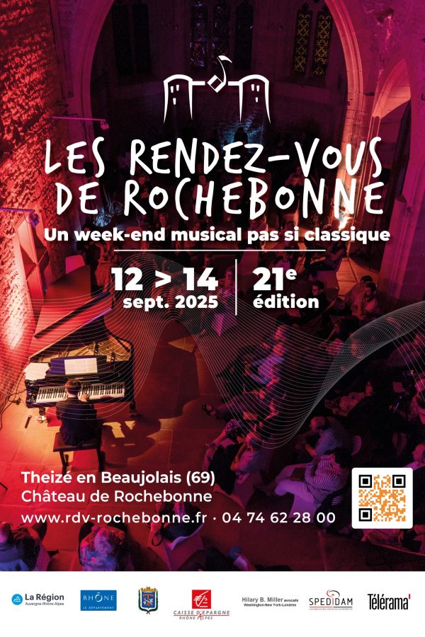 Trouver le château de Rochebonne dans un lieu des temps jadis à Theizé-en-Beaujolais, choisissez un week-end en pleine période de Beaujolais indien, ajoutez quelques Pierres Dorées pour la lumière d’ambiance, ouvrez les oreilles pour découvrir l’acoustique exceptionnelle d’une belle église médiévale. Un Festival d’une immense sérénité. Téléchargez le programme de cette 21e édition
