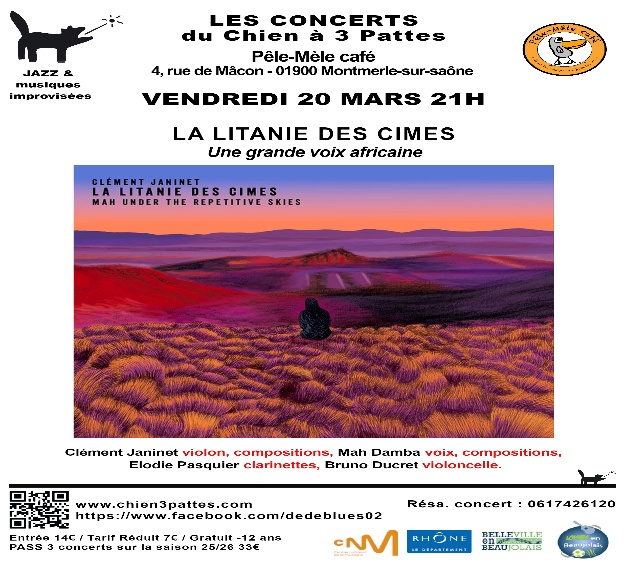 Le Chien à 3 pattes vous propose La Litanie des Cimes - Une grande voix africaine en concert au Pêle-Mêle Café de Montmerle sur Saône (01), le vendredi 20 mars 2026 à 21h.